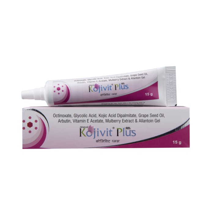 - Uses / Indications: Kojivit Plus Gel is the safest way to lighten the skin tone. It contains Kojic acid dipalmitate, Arbutin, Mulberry extract , Grape seed extract, Allantoin, Glycolic acid and Vitamin E with in built sunscreen. All these constituents act together to block melanin pigments and help in skin lightening effects Key Benefits:1. While most skin lightening products contain kojic acid, Kojivit contains kojic acid dipalmitate, which is much more effective than simple kojic acid, so it gives very fast and effective result ,which is visible from first use only.2. Grape seed extract is rich in flavonoids, they aid in maintaining skins elasticity.3. Glycolic Acid improve the look and feel of skin as well as fade away dark pimple marks.4. Arbutin is considered the safest and most effective skin whitening compound which shows extraordinarily rapid and safe skin whitening properties.5. Mulberry extract is very effective for skin whitening and it has anti inflammatory properties which promotes skin healing.6. Octinoxate is a sunscreen agent to prevent further skin darkening from UVB light.7. Vitamin E is a powerful antioxidant which protects skin from UV damage. Also improves skin texture and aids in moisturization. How to use: Take small quantity of cream and rub on face in circular motion till it disappears and dry completely.Use this cream every time you wash your face to notice visible effects. Use under medical supervision